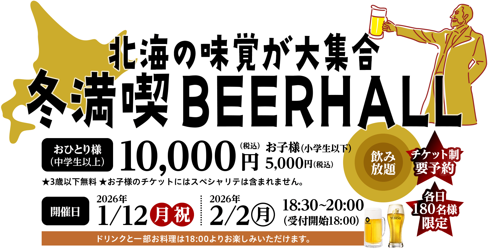 冬満喫BEERHALL 2026 〜 城西館のスペシャルビアホール 〜 城西館の和食・洋食の料理人がお作りする北海道料理を冷たいビールと一緒にお楽しみ下さい。 海鮮の宝石箱 鮑、蟹、雲丹、イクラ、数の子、海老、烏賊、生姜クリーミドレッシング 握り寿司 蟹・帆立・サーモン・甘海老 十勝牛のステーキ 熟成ニンニク醬油ソースとレホールクリームソース 北海道マスカルポーネのティラミス 北海道えびすかぼちゃのプリン 北海道牛乳のシュークリーム 写真はイメージです。 お料理メニュー 【和食】 北海蟹すき鍋、ホッケの蟹餡かけ、北海道風トンテキ、魚介の北海クリーム煮、和牛の北海道味噌のすじ煮込み、蟹シュウマイ 【洋食】 北海道産帆立貝と鯛のアクアパッツァ、北海道産チーズを使ったクロックムッシュ、サーモンのパイ包み焼きイクラ入り白ワインソース、ポルチーニ茸のクリームスープ、ジンギスカン 【コーナー料理】 蟹とじゃがいものかき揚げ天ぷら、札幌味噌ラーメン、北海道風スープカレー ドリンク サッポロ生ビール(黒ラベル、エビス) 瓶ビール(サッポロラガー[サッポロ]、マルエフ[アサヒ]、晴れ風[キリン]) 北海道ワインコーナー 北海道地酒コーナー お飲み物はその他カクテル、ワイン、ソフトドリンクなどをご用意しております。 冬満喫BEERHALL2026年1月12日(月・祝)ご予約はこちら 冬満喫BEERHALL2026年2月2日(月)ご予約はこちら イベント情報商品名 冬満喫BEERHALL 2026開催日2026年1月12日、2026年2月2日予約締切 当日0時までホテル 城西館 お電話でのご予約・お問い合わせは ─ 予約直通 ─ TEL 088-875-0168 (受付時間 10:00〜19:00) メールでのご予約は pof@jyoseikan.co.jp お問い合わせ スイーツフェスタ