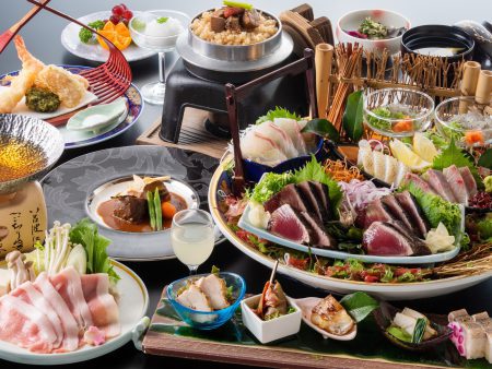 | 皿鉢料理 | 「土佐の豪快盛り」伊勢海老姿造り 大月町産本鮪大トロ 土佐乙女鯛 旬魚 土佐勘八 芽物一式 土佐醤油「黒潮の恩恵」鰹の藁焼きタタキ 薬味一式 タタキ酢 |