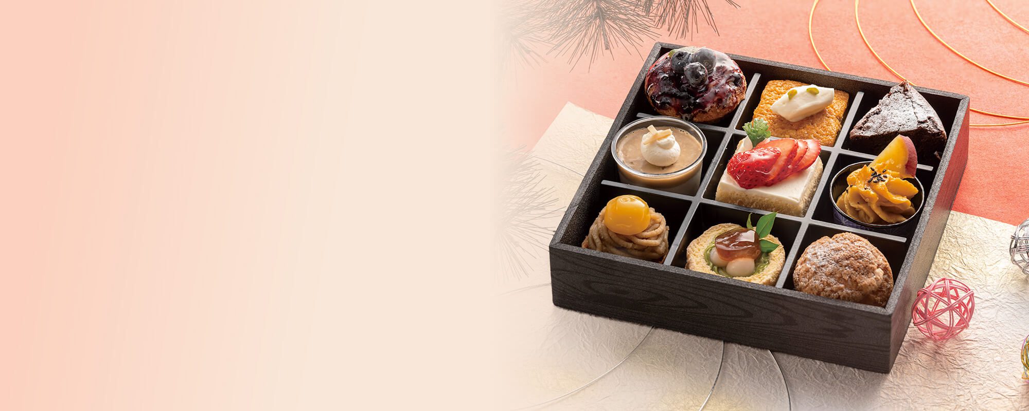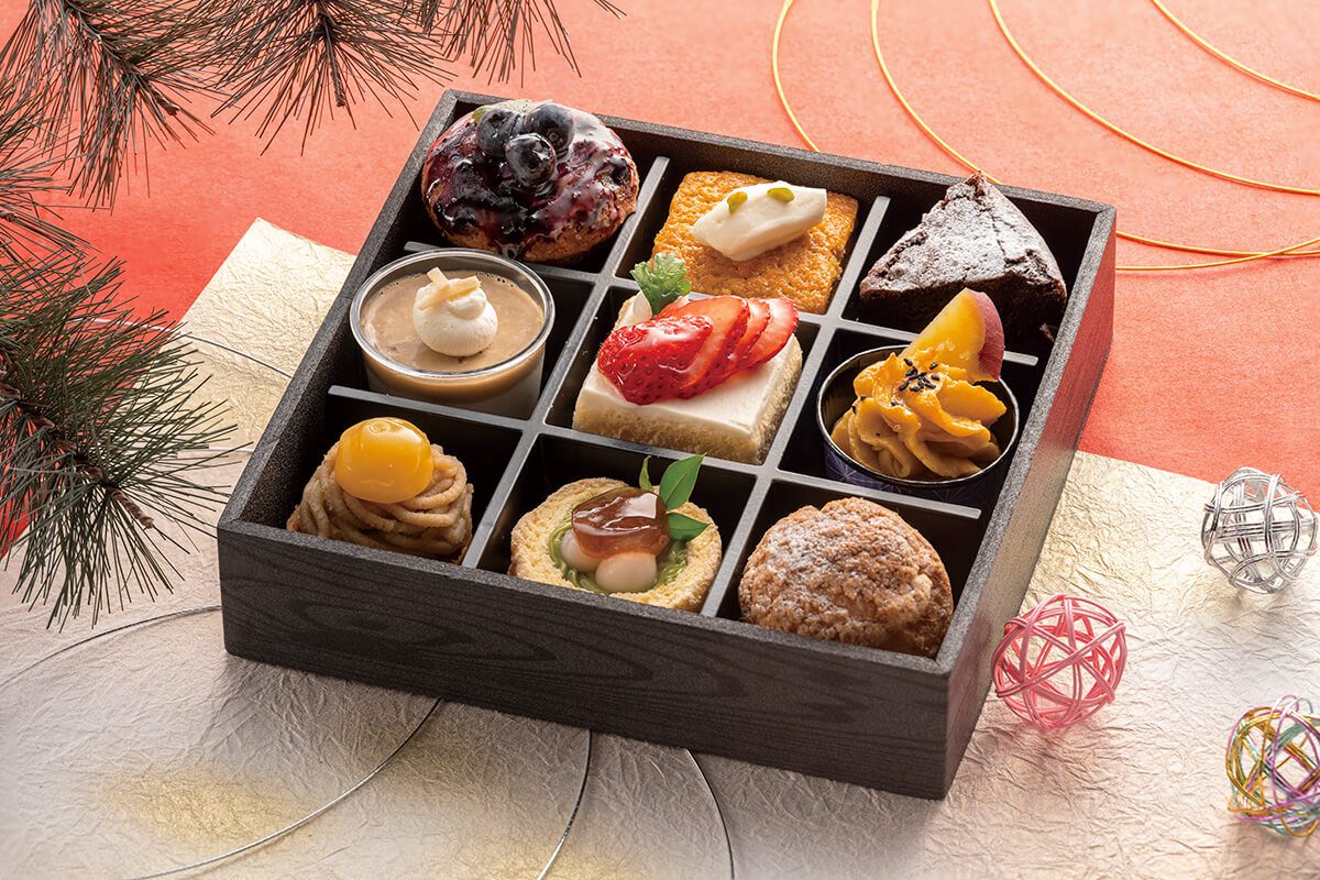 新春を彩る当館のオススメケーキをプチサイズにアレンジしました。伝統的なおせちの雰囲気を持ちつつ、当館の特色を生かしたモダンな一品となっております。一口サイズでさまざまな味を楽しむことができ、お正月のお祝いにぴったりです。